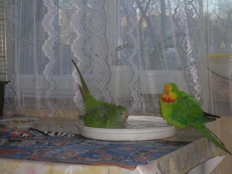 Parę minut temu Piotrek zgasił światło, Aleksander wlazł do klatki, napił się i usiadł na bujawce-czyli kąpiel(nie kąpie się w baseniku, misce...rozkłada skrzydła i pryskaj mnie, pryskaj)