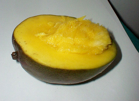 Owocem mango jest pestkowiec o długości do 15 cm. Skórka ma zielonożółtą, pomarańczową lub czerwoną barwę. Soczysty miąższ jest koloru żółtopomarańczowego, ku środkowi jest coraz bardziej nitkowaty. Wewnątrz znajduje się duża pestka otoczona włóknistą powłoką.