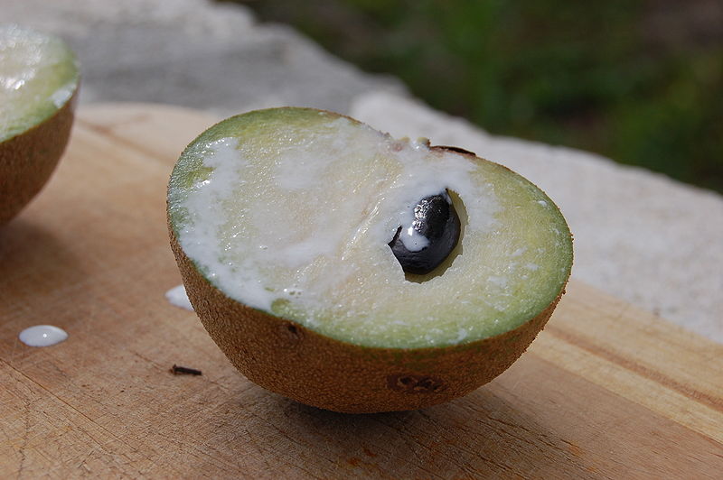 Owocem jest brązowa jagoda. Szorstka skórka jest niejadalna, pod nią znajduje się miękki, słodki miąższ koloru brązowo- czerwonego. W miąższu znajdują się 1-4 duże czarne pestki. Miąższ sapodilli jest bardzo miękki, toteż owoc ten jest bardzo wrażliwy na uszkodzenia mechaniczne