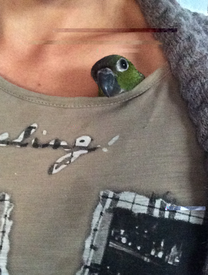 frania też jest pieszczochem. bardzo lubi sie wtulać i być smyrana po łebku. ostatnio też ulubiona zabawa stalo sie wchodzenie pod bluzkę. śmiesne uczycie kiedy ona tak biega po materiale i mizia po plecach czy brzuchu. niestety porafi też być mniej czuła i dziobie mocno- nie wiem czemu upatrzyła sobie miejsce tuż nad lewą piersią. ojjjj to boli mówię wam!!!