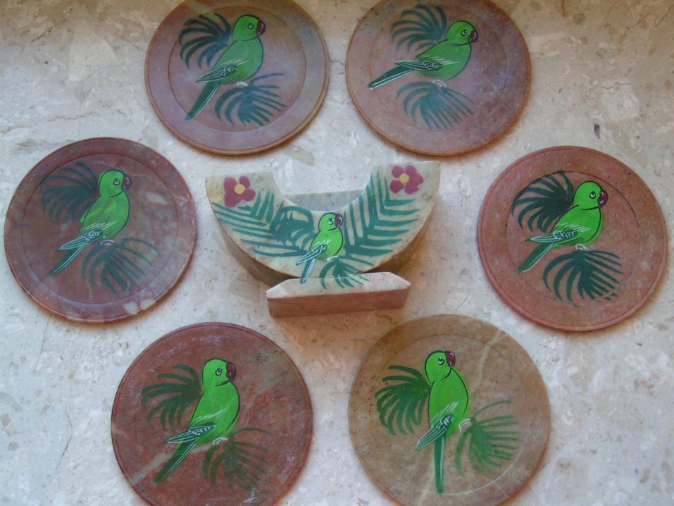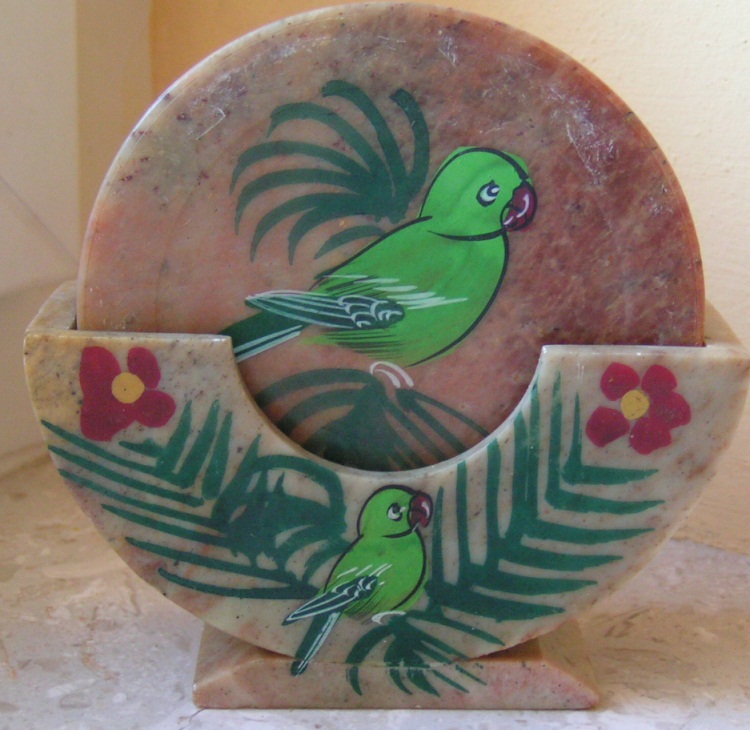 Podstawki są z jakiegoś tam marmuru, a kilka dni temu kupiłam drewniane, ręcznie malowane 2 papugi- patyki do kwiatków. Jak do mnie dotrą to wstawię fotki