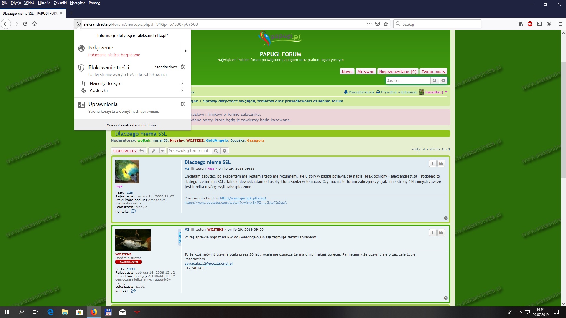 Dawniej tego napisu nie było, ponieważ producenci przeglądarek nie zdecydowali się na jego wyświetlenie jeśli użytkownik wchodził przez http, a nie https. Forum było bezpieczne i jest bezpieczne. Serwer plików jest regularnie skanowany w poszukiwaniu sygnatur znanych zagrożeń. Napis natomiast będzie, ponieważ na forum często wrzucane są/były zdjęcia np. z garnek.pl bez przedrostka https://, powoduje to pobieranie ich niezabezpieczonym protokołem. Jestem pewien, że taka informacja wyświetla się kiedy wchodzisz na garnek przez swój podpisFiga pisze: ↑pn sie 12, 2019 08:57Rozelka, chodzi o to, że dawniej tej informacji nie było, bo forum było zabezpieczone, a teraz niestety, ale jest niezabezpieczone i nic nie chroni naszych danych. Niewiem dlaczego tak jest, że teraz forum jest niechronione, może to kwestia finansowa, jak ktoś wcześniej napisał.