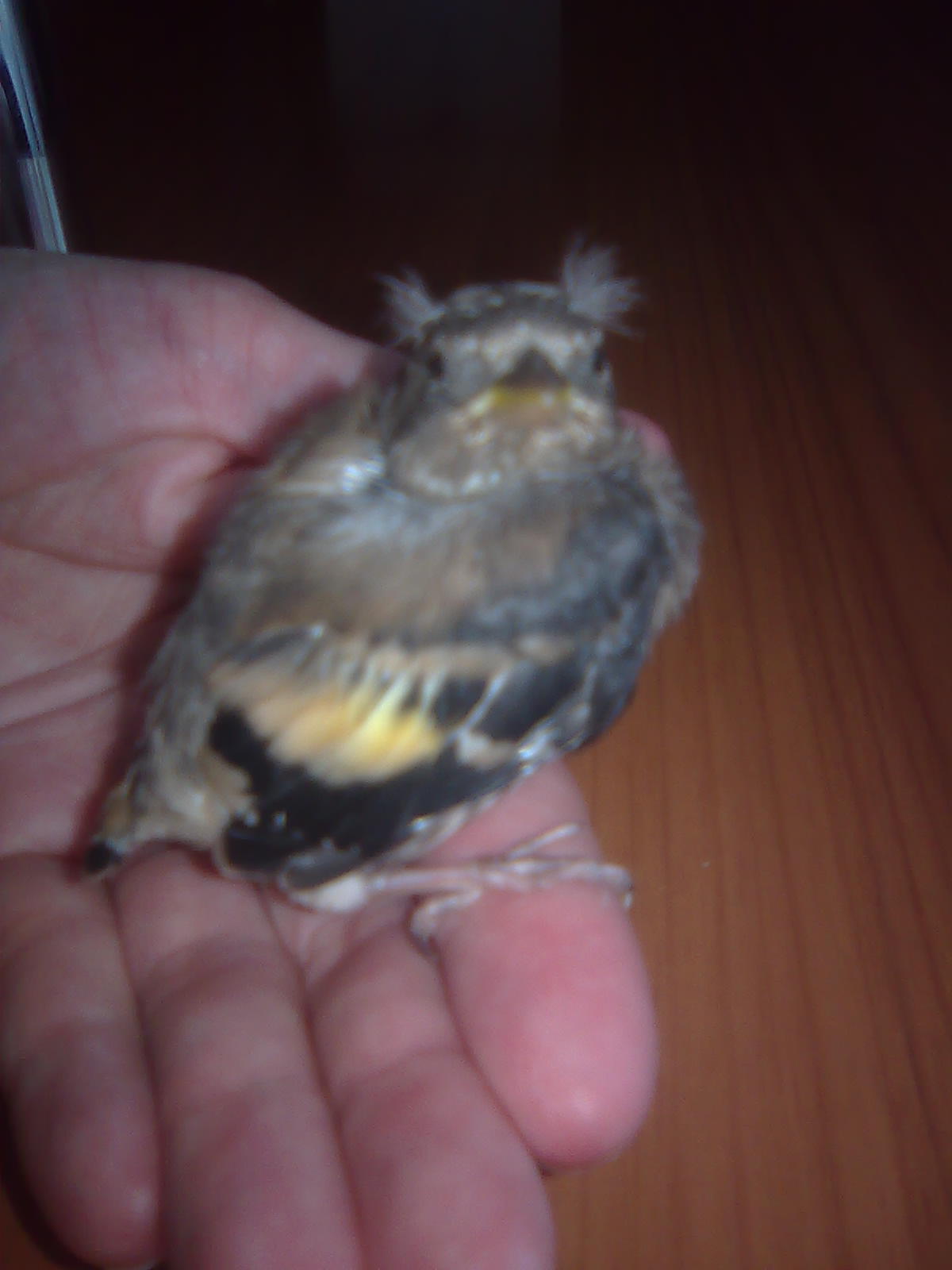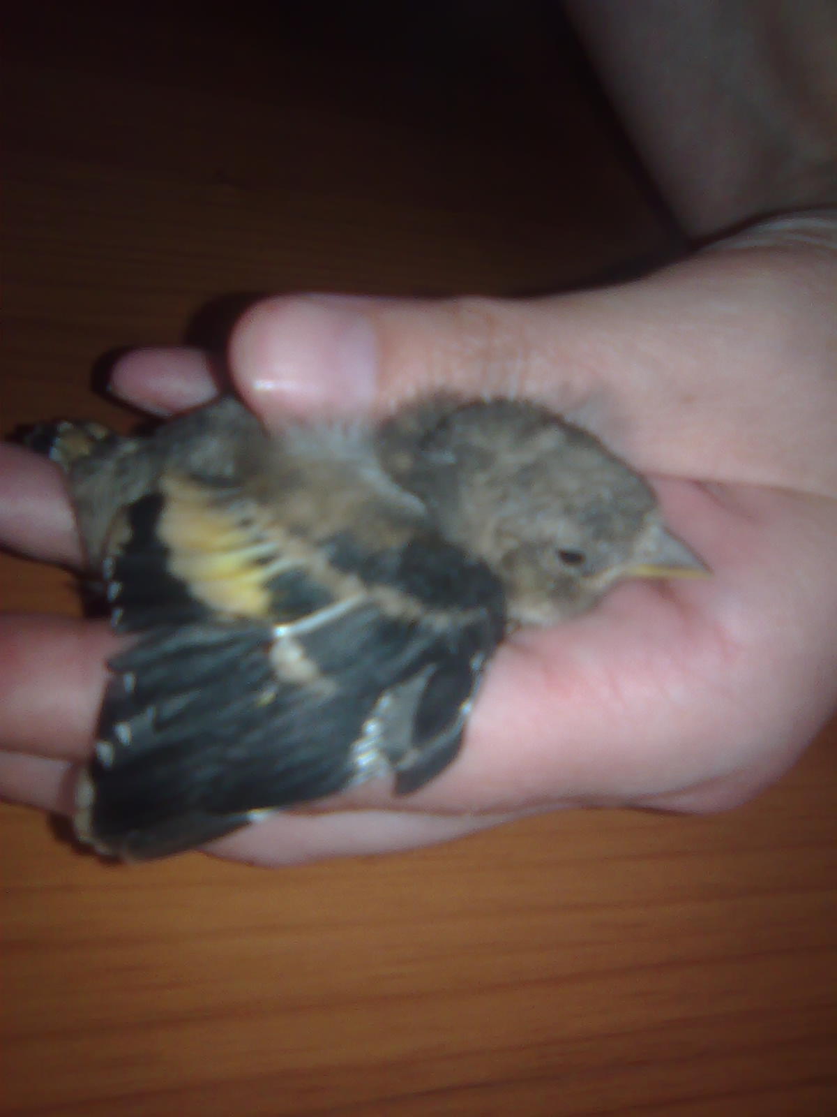 Na fotce niestety nic nie widać. Zrobiłas błąd, ptaków się nie bierze jesli nie mają widocznych ran. Młode często opuszczają gniazdo przed uzyskaniem zdolności lotu i przesiadują na gałęziach. Czasami spadają. Wtedy najlepiej je wrzucić na najbliższe drzewo. Teraz musisz pisklaka karmić żywym pokarmem, tak jak to robią rodzice czyli przez cały czas.