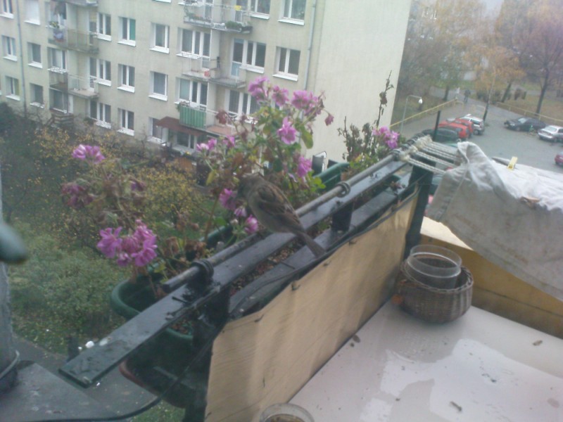 Poczatki jesieni gdy kwiaty jeszcze kwitly juz przylatywaly no to troche im sypalam ziarna do korytka