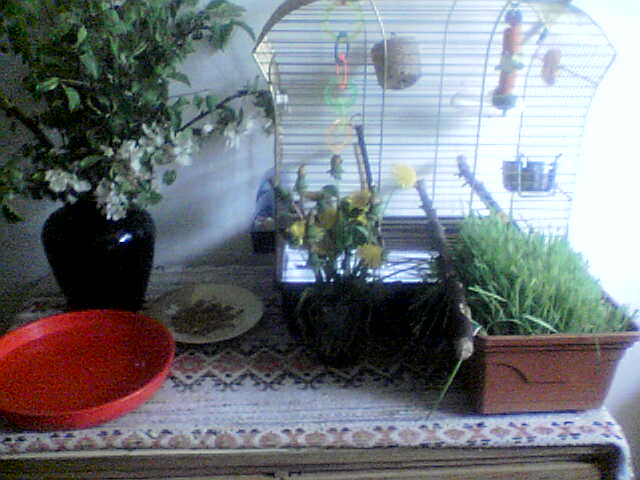 Miałem na balkonie taki gałęzie wierzby, grube konary. Pieknie póściły pąki i gałązki,ale wytrzymały tylko 2 tygodnie. Musisz mieć z 5 donic żeby starczyło na dłuzej.Nie wiem czy nie lepiej zamocować na balkonie jakąś obejmę i zmieniać tylko wiaderka z gałęziami Zacznij nowy temat o wolierze na balkonie.