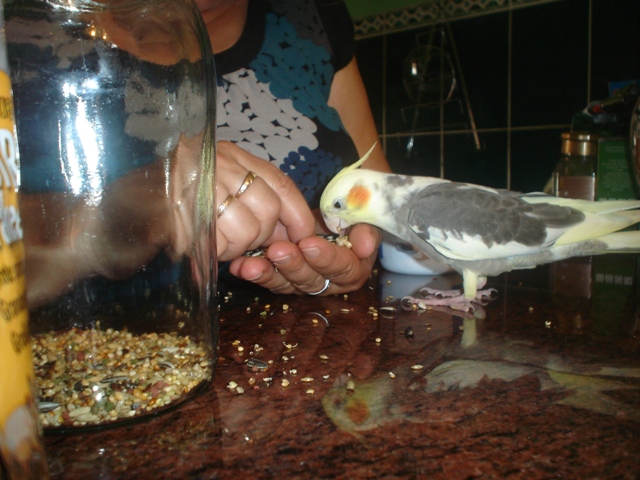 Nie było mnie tu baardzo długo, bo WAS zgubiłam i nijak nie mogłam odnaleźć tego adresu. Znalazła mnie administratorka Krysia, za co jestem jej bardzo wdzięczna. Nasza papużka mieszka z nami niedługo, bo zaledwie dwa miesiące a już zdążyła zaprzyjażnić się z nami. Ela była prezentem urodzinowym dla 7-letniego Filipka. To był bardzo udany prezent. Kupiliśmy ją we wrocławskim sklepie, w galerii Pasaż Grunwaldzki, gdyż właśnie tam znajomy męża jest pracownikiem tego sklepu jak i hodowcą nimf. Papużka miała trzy miesiące. Już po trzech dniach zaczęła oswajać się z nowym domem i z nami. Po tygodniu wyladowała na mojej głowie. Dzisiaj przebywa praktycznie cały dzień poza klatką. Lata, chodzi sobie po domu i poznaje wciąż nowe miejsca. Lubi obgryzać ołówki, zwłaszcza wtedy, gdy moje dzieci odrabiają lekcje. Lubi skosztować, co dzieci akurat jedzą. nie boi się naszego boksera a pies w ogóle na nią nie reaguje. Ela uwielbia świeże proso z naszego ogrodu. Wieczorami jest bardzo grzeczna i chętnie sypia w swojej klatce. Rano woła, by ją otworzyć. My wychodzimy do pracy i szkoły a ona ma cały dom dla siebie. Jedyny problem to jej kupki, które zastajemy po powrocie. Trzeba je usuwać a to nie jest takie proste jak powycieranie kurzu.