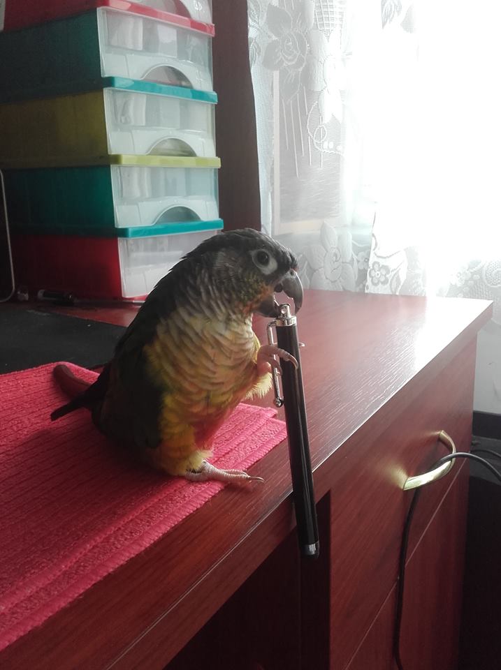 Czwartym pierzastym był Zenek, nasza rudosterka. Nauczyliśmy go trochę słów, które mówi niewyraźnie (jak to rudosterka). Część ze słów była nauczona przez przypadek, np jak gryzie palec to mówi "nie można" lub "no no no"