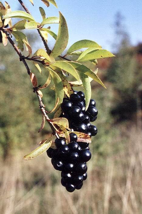 Owocem są zebrane w grona elipsoidalne, lśniąco czarne jagody.