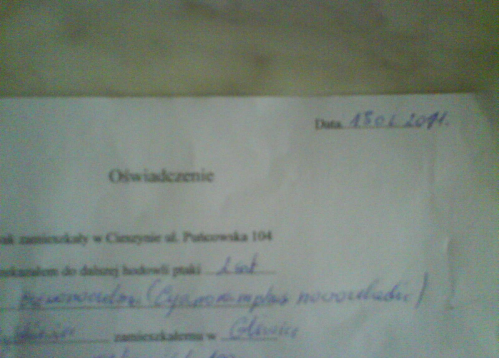 przyjrzałam się dokładnie dacie i było napisane 2001 i zostało poprawione na 2011 na zaświadczeniu jest data wyklucia papugi 11.10.2010 podpisane przez starostę cieszyńskiego jest podany znak wpisu WS.L6134-00047/10