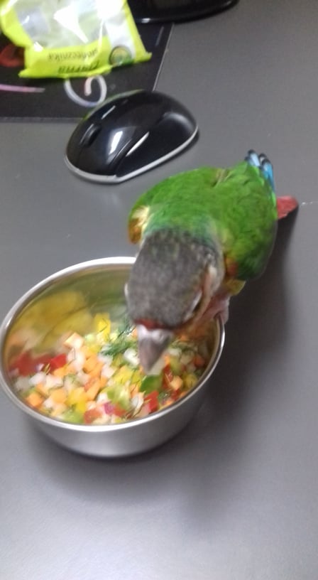 Dieta już wprowadzona. Jako że niedawno przyszła świeża paczka karmy, wczoraj z córką bawiliśmy się w kopciuszka wybierając słonecznik. Ptaszysko ma codziennie miskę świeżych owoców, ale dość wybredny jest. Obecnie jabłko jest na cenzurowanym, za to marchewka wróciła do łask