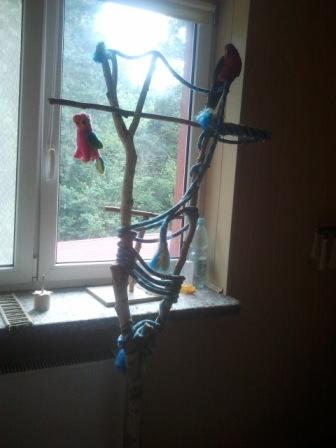 Julek ma swoją wolierę, w której spędza tylko cza gdy nas nie ma co nie zdarza się zbyt często jednak siedząc tam zachowuje pełny spokój przysiada na 1 nóżce u zwyczajnie przesypia czas do powrotu rodziców:)