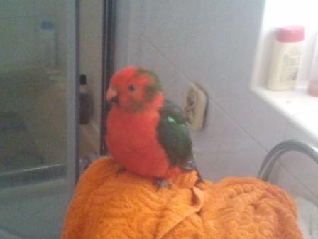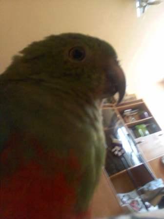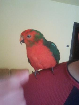 Rada dla tych, którzy szukają papużki zabawki: Kurka jest jak ja to mówię autystyczna. Czyli o łapaniu, mizianiu pod piórkami za głowa itd nie ma mowy. Może i unnych jest inaczej ale z 4 szkarłatek jakie znam plus nasz Julo wygląda to tak samo. Będzie uwielbiał z wami siedzieć non stop zwłaszcza jak robicie coś ciekawego, ale głaskanie ogranicza się do głaskania po klacie i po dzióbku. Ale za to chętnie daje buziaki i uwielbia przylecieć z czymś dobrym żeby nas dokarmić tym co aktualnie ma w dziobie;] Mi taki charakter w zupełności wystarcza np.:)