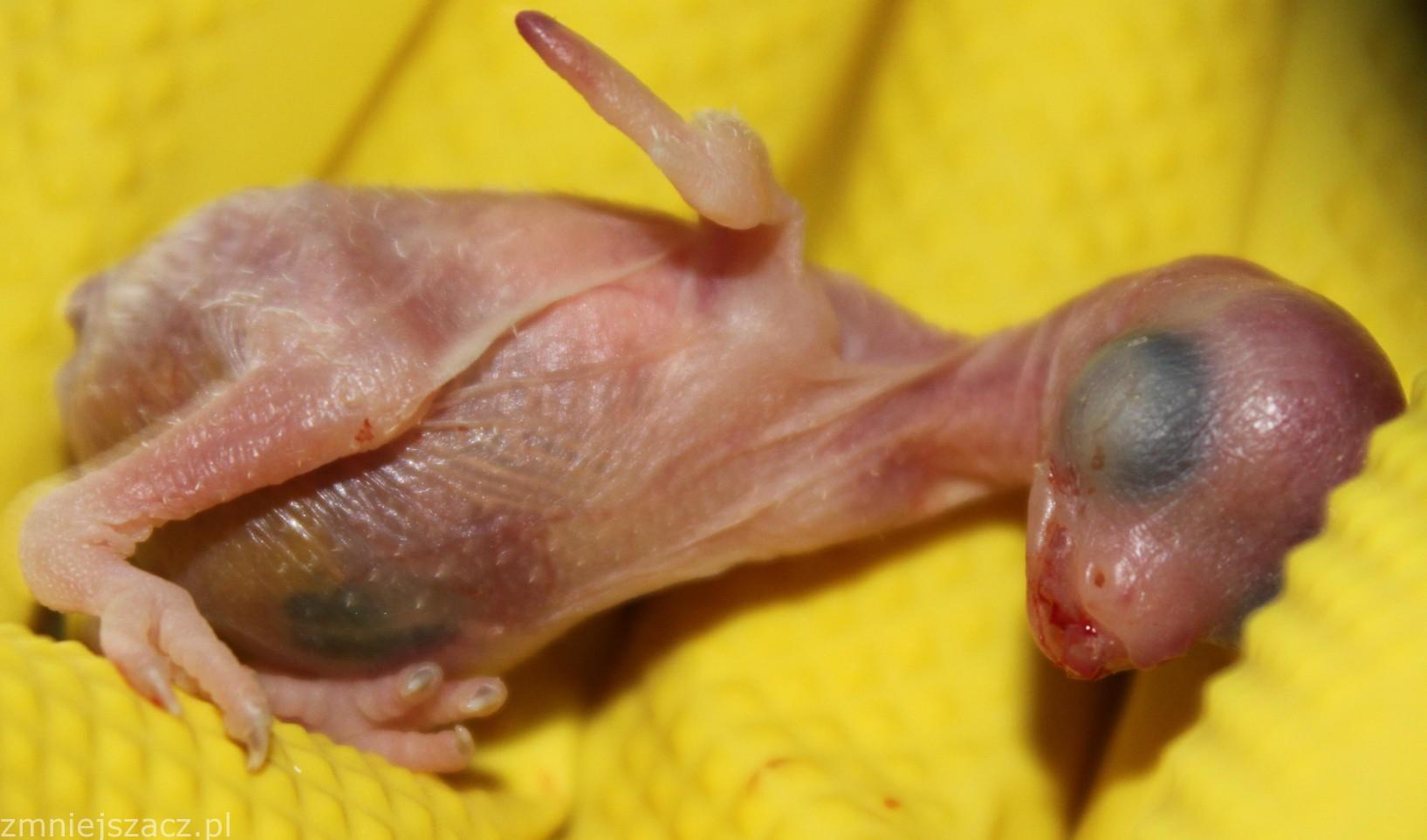 Tak sobie teraz myśle co będzie jeśli z tego wyjdzie,jak będzie spożywał pokarm bez górnej części dzioba ale ważne jest też jak on będzie wyglądał!?Wszystkie młode ptaki muszą być wydane!Co ze skubaniem,żyć z wiecznie otwartym dziobem i widoczną krtanią.Czy nie będzie podatny na infekcje z powietrza.Czy podczas upadku z wys 1 m na dno klatki nie doznał obrażeń wewnętrznych.Nie wiem na ile uszkodzenia dzioba prawie pod same nozdrza wpłyną na jego życie i jego właścicieli.Mam mieszane odczucia.Zdrowy rozsądek podpowiada mi że natura nie powinna dać żyć takiemu osobnikowi ,lecz sumienie to, że palcem nie kiwne do zabicia-nawet nie wiem jak miałbym to zrobić.Mamy z żoną burze mózgów.Mija kolejna doba ,czekamy ale czas nie działa chyba na jego korzyść.Jest mniej ruchliwy i zdecydowanie mniejszy od pozostałej dwójki pomimo że to 1 piskle.Jak ktoś ma jakieś pomysły,chętnie poczytamy ,na tą chwile tylko czekamy-pytanie jak długo.Poniżej fotka