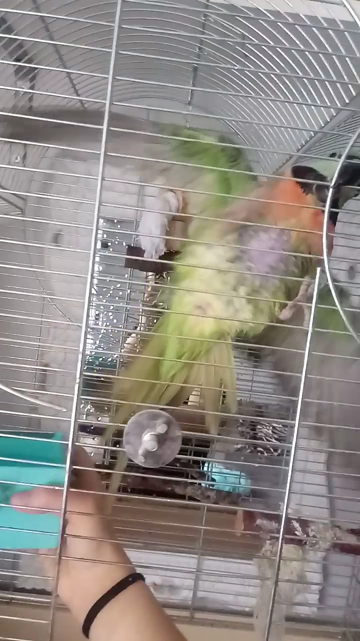 Wiem, że to absolutnie nie Twoja wina i że przejęłaś ją tak jak stała - jednak ma fatalną klatkę :( jest za mała, i ma fatalny kształt. Papugi żle czują się we wszelkiego rodzaju okrągłych, zaokrąglonych klatkach - najlepsze są po prostu prostokątne z płaskim dachem. Ja Cię absolutnie nie oceniam, bo wiem, że to nie Twoja decyzja, ale jeśli kiedyś będziesz miała możliwość, kupić coś większego, w normalnym kształcie - nawet używane - na pewno warto :)