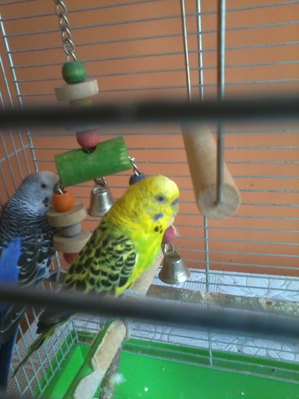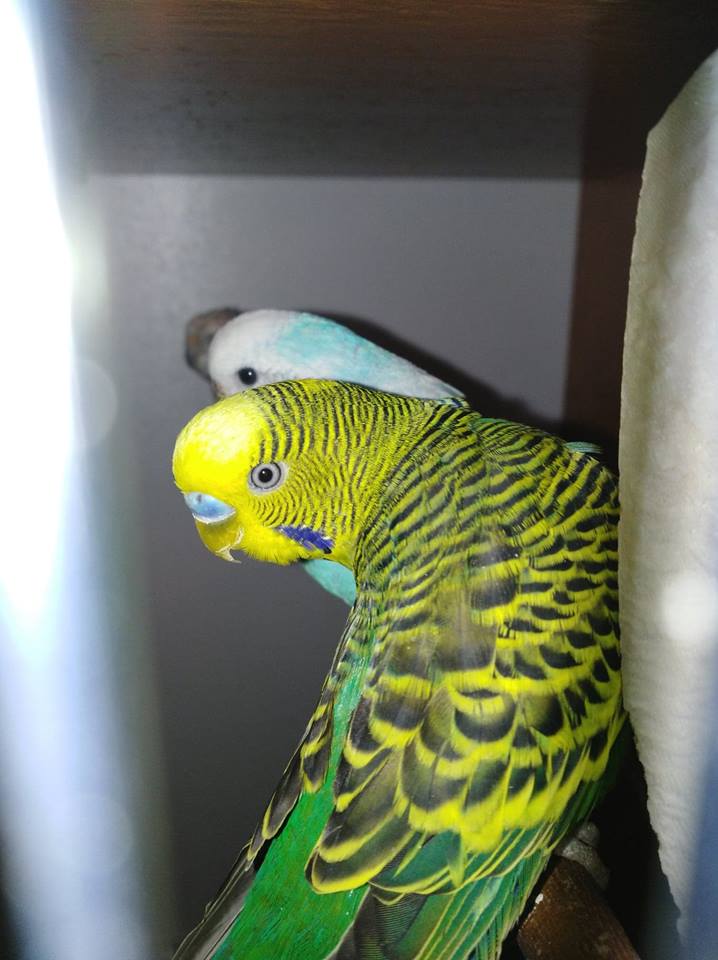Ta zielona to właśnie nasz "maluszek", później nazwany Green. W klatce jest jest jego tatuś, czyli Szafirek. Ja wiem, ze klatka i wyposażenie jest fatalne, wtedy za dużo jeszcze nie wiedziałam
