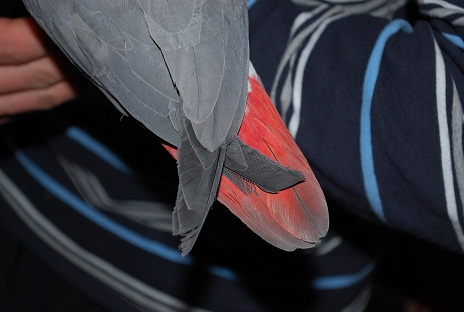 zako kuki, bez urazy proszę ale wcześniej nic nie pisałeś o lotkach, tylko ogólnie o piórach :-( Jedno z tych dłuższych piór (tuż nad czerwonym ogonkiem) rzeczywiście nosi ślady mechanicznego uszkodzenia ale te w skrzydłach są cięte.