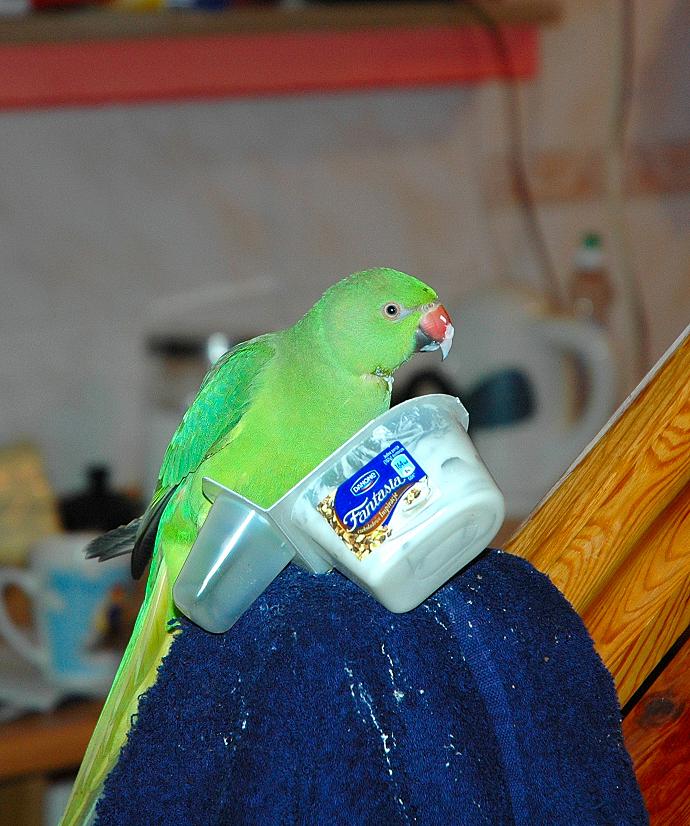 Papug je "ludzkie jedzenie". Wiem ze tak nie powiino być. wypuszczamy papuga rano jak szykujemy się do pracy - czyli jemy sniadanie, i wieczorem jak wracamy i tez jemy. I przez to papug nie chce juz jesc ptasich przysmakow, a i owoce i warzywa je mniej chętnie. Np. te ptasie biszkopty wrzuca w calosci do wody. Z drugiej strony jak jemy i go nie wypuszczamy to sie robi agresywny. Rzuca sie na pręty, strasznie skrzeczy, wyrzuca miskę z wodą, trzepocze skrzydełkami. Chyba go rozpiescilismy. Za towarzyszenie przy jedzeniu jogurtu da sie pokroic. Oczywiscie staramy się ostroznie mu dawac nasze jedzenie- solone lub przyprawione rzeczy chowamy. Czy w małych ilosciach "ludzkie jedzenie" mu zaszkodzi?