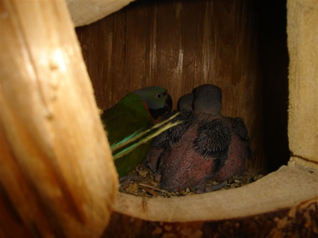 Para z Czeska(tak ją nazwę) zagniazdowała u mnie po raz pierwszy dopiero w roku 2010 samica zniosła 3 jajka, z czego dwa były zalężone jedno czyste. Jednak podczas kontroli budki w 2 tygodniu wysiadywania zauważyłem że w jajku zalężonym jest dziurka co spowodowało że już tylko jedno jajko było dobre. Niestety po upływie 26 dni wysiadywania zabrałem i to jajko gdyż nic nie kluło się po rozbiciu skorupki okazało się, że pisklę prawdopodobnie udusiło się nie mogąc przebić skorupki. A więc pierwszy lęg tak wyczekiwany był nieudany. W roku bieżącym posiadałem już 2 pary tych pięknych papug(uważam, iż posiadanie kilku par danego gatunku daje lepsze efekty hodowlane) wszystkim aleksandrettom(posiadam jeszcze obrożne) powiesiłem budki lęgowe w połowie grudnia. Budki lęgowe wykonane z naturalnych pni drzewa z dłutowanym środkiem o wysokości ok. 60 cm i podstawie 30 cm otwór wlotowy 7, 5cm dno budki wysypane wiórami.