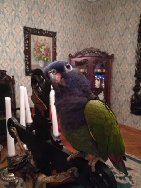 Chciałabym przedstawić takiego oto przystojniaka. Enzo,piona niebieskoglowa, urodził się w Krakowie na początku lipca 2015roku jako pierwszy z miotu (?:). Jego rodzice, o ile dobrze pamiętam, pochodzą z Belgii. Jest to ptak z charakterem wymarzonym dla mnie i pewnie każdego początkującego opiekuna papug.