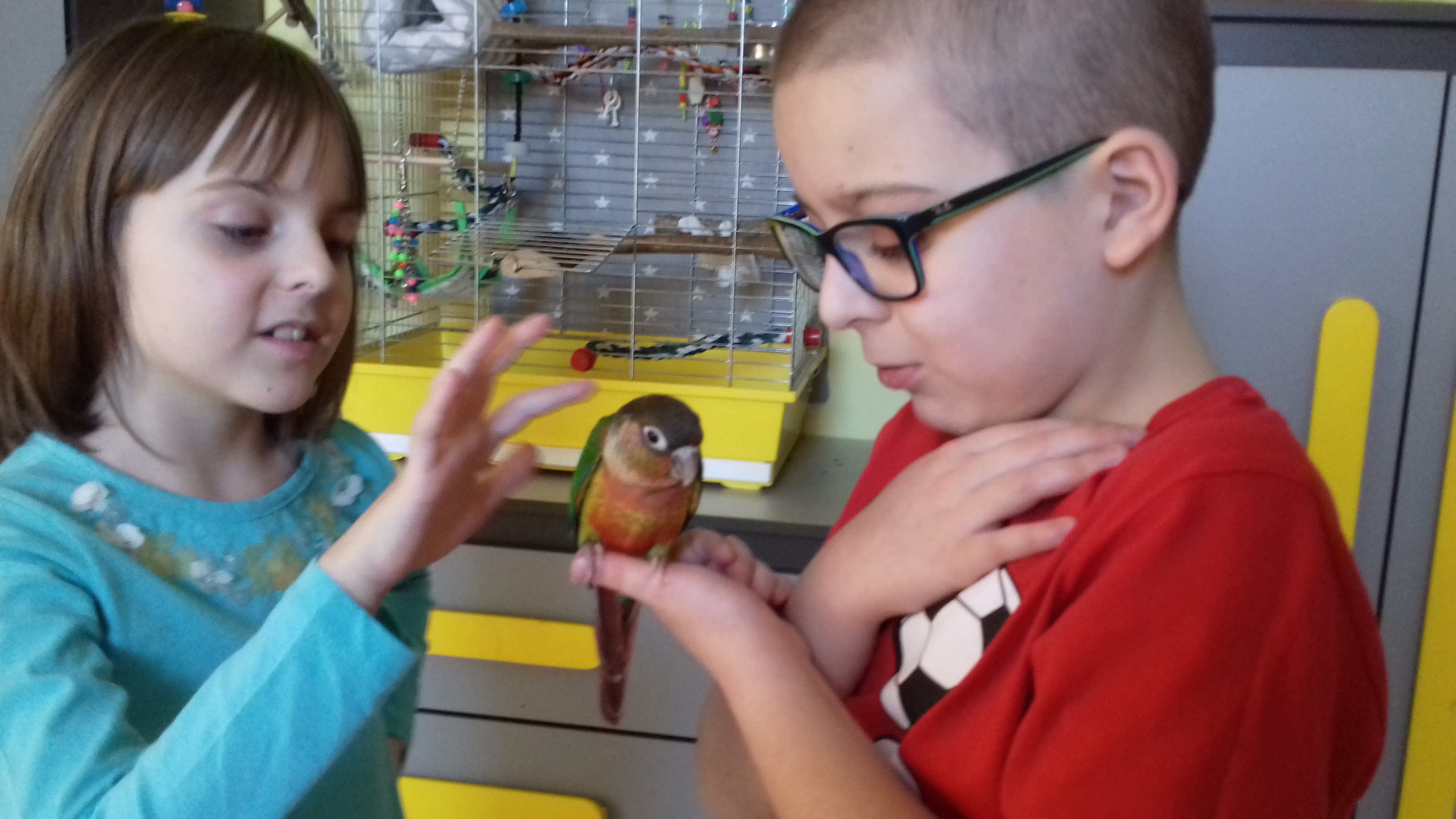 Juz dopomina sie towarzystwa bo jak wychodzimy z pokoju to skrzeczy :) wracamy to spokoj. Siedzi przy klatxe i daje dzis dziubek do glaskania :)