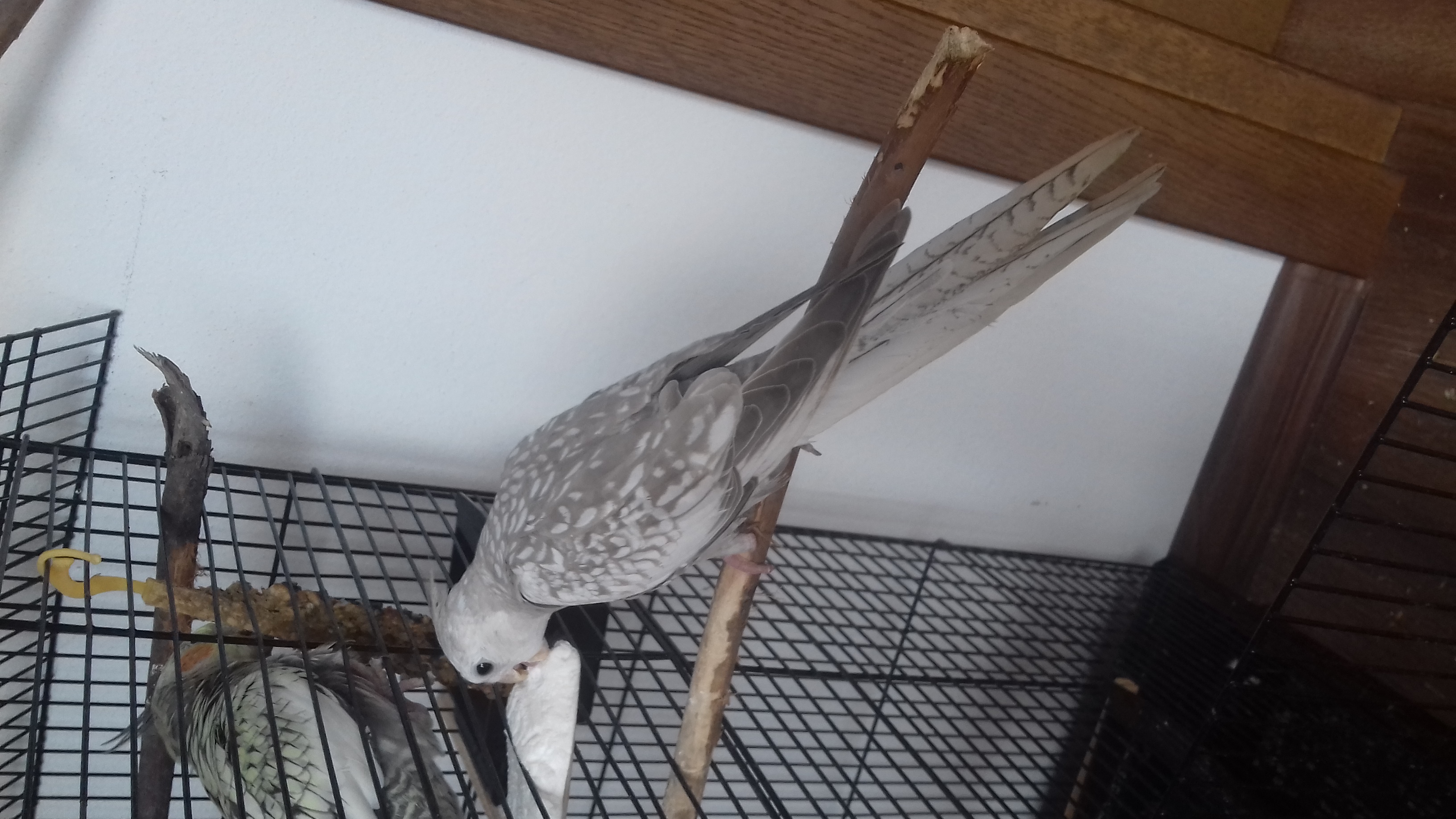 Tu są te papugi. No mi się wydaje że ten lutino jest samcem , bo tak gra dziobem w budkę lub klatkę , częściej się odzywa , układa skrzydła w serce.