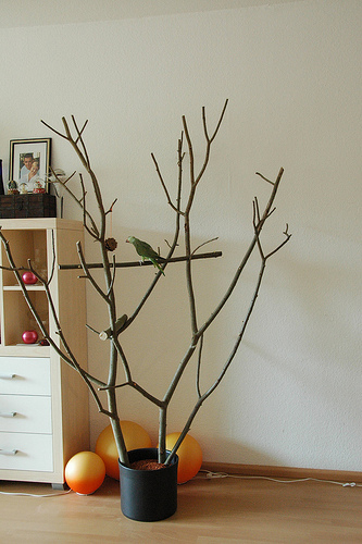 Witam:) Drzewko Fibi sie rozrasta:)))) Dolozylam kilka galezi do gory i to byl strzal w dziesiatke:))) Chyba zapadlam na papugomanie..... :))))))))))))) Odkad mamy drzewko, Fibi siedzi od rana do wieczora poza klatka, nawet podaczs naszej nieobecnosci bo majac drzewko, okna ja nie interesuja.... poza tym zlikwidowalam jej siedzisko kolo okna i nie ma jak ich tam jak skubac. Chyba ze w locie:))))))) Pomysl z drzewkiem powstal dlatego bo mamy piekna i ogromna lampe ktora sklada sie i mnostwa poskrecanych drucikow, z krysztalkami swarovskiego.... raz ze sie balam ze przegryzie ten krysztal i sie skaleczy a dwa balam sie ze sie poparzy.... tak jak ja:((( Chcialm ja sciagnac z tej lampy, podalam patyczka zeby ja sciagnac i dotknelam wewnetrzna strona reki taka plaska zaroweczke... fuck! Jaki bol!!! I mam takie poparzenie jak od zelazka, piekna ciemna plama na reku:((( I boje sie ze jak ona bidula to dotknie jezykiem a moze jej sie tez piorka przypala??? A po trzecie maz dostawal spazmow ze ona mu tam siada na lampie za 600 euro.... Wiec znalazlam rozwiazanie. Na lampe zarzucilam dwa lekkie szale ( i juz tam nie laduje) i postawilam jej drzewo:))) Dziala bosko:))) Siedzi sobie tam, podjada rozne smakowite rzeczy, czysci piorka, spi, zgrzyta dziobem:))) No pelnia szczescia:)))) Jutro maz bedzie pilowal pieniek zeby jej zrobic deski do siedzienia i pod miejsca gdzie jej jedzonko zostawiam zeby az tak nie syfila:))) Choc pozytyw z syfienia tez jest:))))) Moj pies Hugo robi za odkurzacz:)))) I pozera wszystko co lezy na dole:)))) Mam pytanie, jak moj maz mi te deski zrobi musze je wyszlifowac zeby byly gladkie czy moge jej zamontowac jakie nauturalne???? Nie bedzie drzazg??? nie pkalecz sie??? Od razu powiem ze to wierzba.... a oto troche rozbudowane drzewko:)))