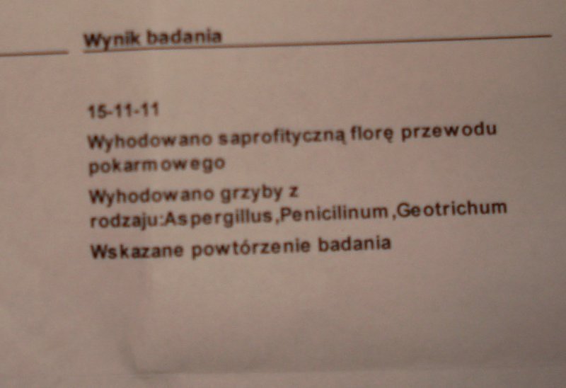 Test na "typowe" bakterie - cos tam bylo, dostal antybiotyk, bakterie zniknely