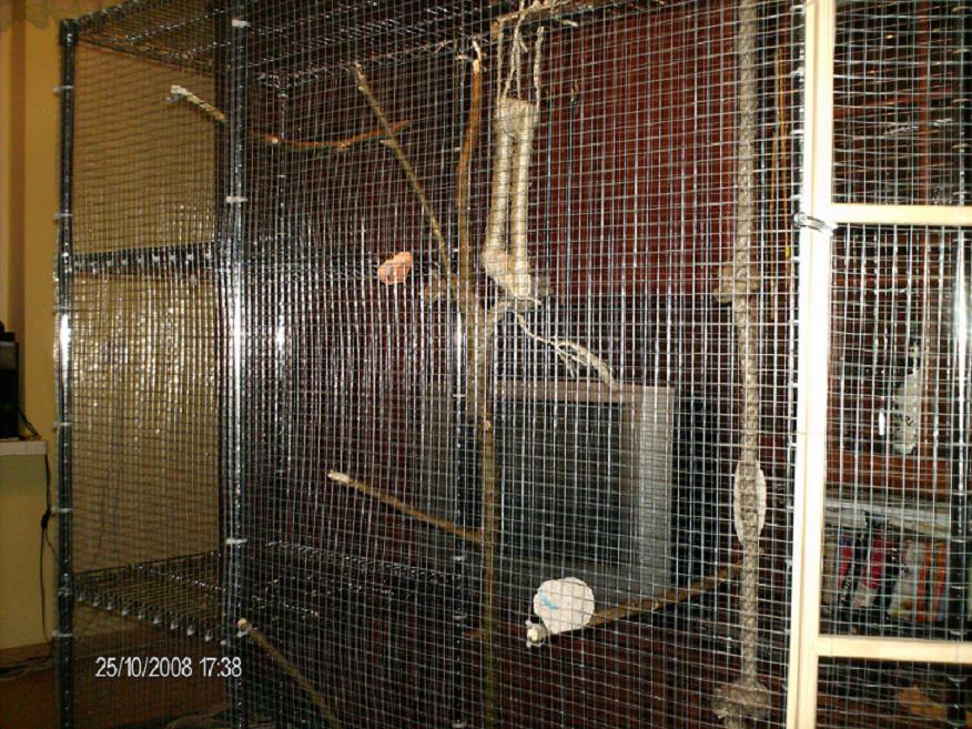 Wadą klatki jest na pewno szerokość, ale nie przesadzajmy :) jeden ptak spokojnie przelatuje z jednego końca w drugi :) Po drugie, codziennie są wypuszczane, a wracają do klatki, kiedy mają na to ochotę :) Nad klatką, powoli (brak czasu) powstaje plac zabaw. W samej klatce przemeblowałem już chyba z dwa razy. Dopasowuję ją na podstawie obserwacji. Sama garderoba kosztowała chyba 220 zł. Jest jeszcze inna wersja. Krótsza(około 130 zł).Tak jakby obciąć część z półkami. Nie brałem jej, bo była mniejsza i w czarnym kolorze. Nie wiem jakiego rodzaju farbą była pomalowana...
