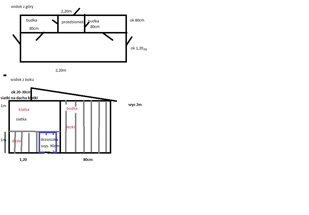Z czego sama klatka będzie miała szerokość jakieś 1,20m, ponieważ tył klatki zamierzam zrobić budkę której szerokość będzie wynosić jakieś 80cm jako schronienie przed zimą oraz myślę by tam powieszać budki lęgowe szkic macie poniżej.