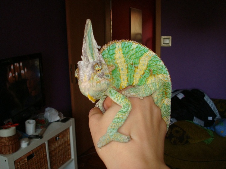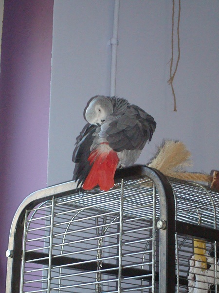 Tego nie potrafię zrozumieć z uwagi na wiek malucha. Pojutrze skończy dopiero rok. Staram sie unikać takich sytuacji, żeby Bolek nie skrzywdził malucha. Ale latająca papuga nie daje się tak łatwo zbić z tropu. Zawsze poleci tam gdzie chce. Poza klatką małego nie idzie przekonać do wejścia na rękę. Na rękę wchodzi tylko jak jest w klatce i tylko wieczorem. W dzień prędzej odrąbie palce niż na rękę wejdzie. jak przychodzi wieczór ( około 19/20 ) maluch robi się słodki i zaczyna domagać się pieszczot. Wtedy tylko wyciągnę rękę a jego stopa od razu ląduje w odpowiednim miejscu.