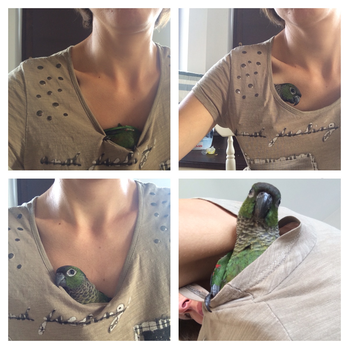 frania też jest pieszczochem. bardzo lubi sie wtulać i być smyrana po łebku. ostatnio też ulubiona zabawa stalo sie wchodzenie pod bluzkę. śmiesne uczycie kiedy ona tak biega po materiale i mizia po plecach czy brzuchu. niestety porafi też być mniej czuła i dziobie mocno- nie wiem czemu upatrzyła sobie miejsce tuż nad lewą piersią. ojjjj to boli mówię wam!!!