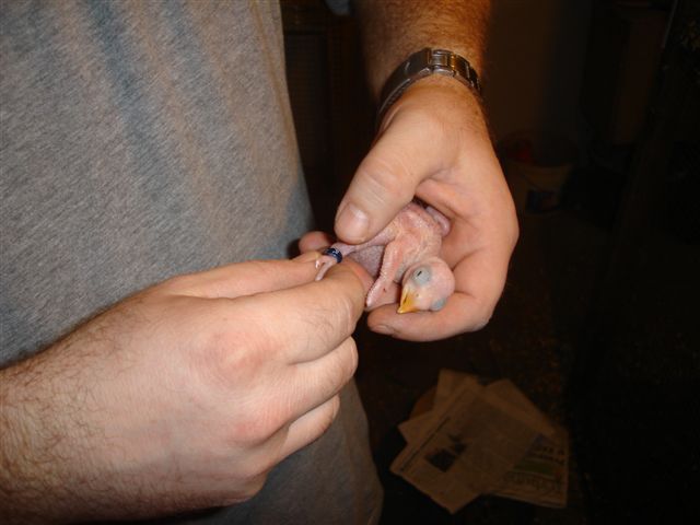 Po ok. 21 dniach wysiadywania wykluły się pierwsze pisklaki. U nowej pary 4 pisklę niestety padło (było dużo mniejsze od trójki rodzeństwa, bo wykluło się po 5 dniach od pozostałych) samica bardzo sumiennie karmiła i karmi dalej młode i w 11-12 dniu życia pisklaki zaobrączkowałem obrączkami rodowymi o rozmiarze 6, 5 mm