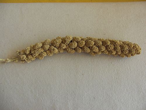 Normalne proso jest jakby wiechą, bez drewienka w środku i bez żadnego lepiszcza użytego do scalenia ziaren do patyka. Takich kolb nawet smakowych nie podawaj zbyt często bo jedzenie z nich żadne, a i nie wiadomo co jest użyte jako lepiszcze.