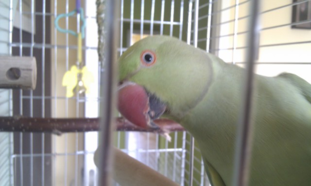 Teraz kwestia dziubka, w klatce ma specjalne żerdziki oraz sepię, jednak chyba ze stresu mało z tego korzysta (z sepi praktycznie w ogóle), po jedzeniu woli wyjść od razu na klatkę i tam, bez większych rezultatów próbuje ocierać dziubek o żeberka klatki.