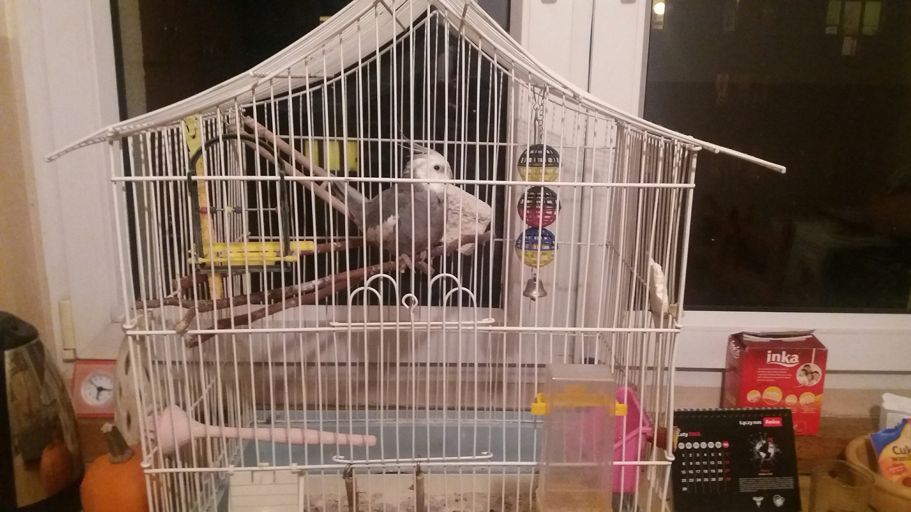 w sierpniu 2015 r. przyleciała do mnie nimfa białogłowa. Przygarnęłam małą ponieważ nie mogłam znaleźć jej właścicieli. W tym miejscu muszę zaznaczyć, że nie znam się absolutnie na ptaszkach... Papużka dostała klatkę i sporo "zabawek". Trochę poczytałam o zachowaniu oraz odpowiedniej opiece nad nimfami. Mam wrażenie, że ptaszek szybko się do mnie przyzwyczaił (jak wychodzę z pokoju to głośno "nawołuje", tak samo jak słyszy, że wracam do mieszkania - przez jej krzyki muszę ją wszędzie ze sobą zabierać w domu :)). Mini (tak się wabi :)) wydawała się oswojona ale bardzo boi się po dziś dzień dłoni (nie można nawet zbliżyć ich do klatki bo od razu atakuje), za to bardzo lubi przytulać się do buzi albo siadać na głowie