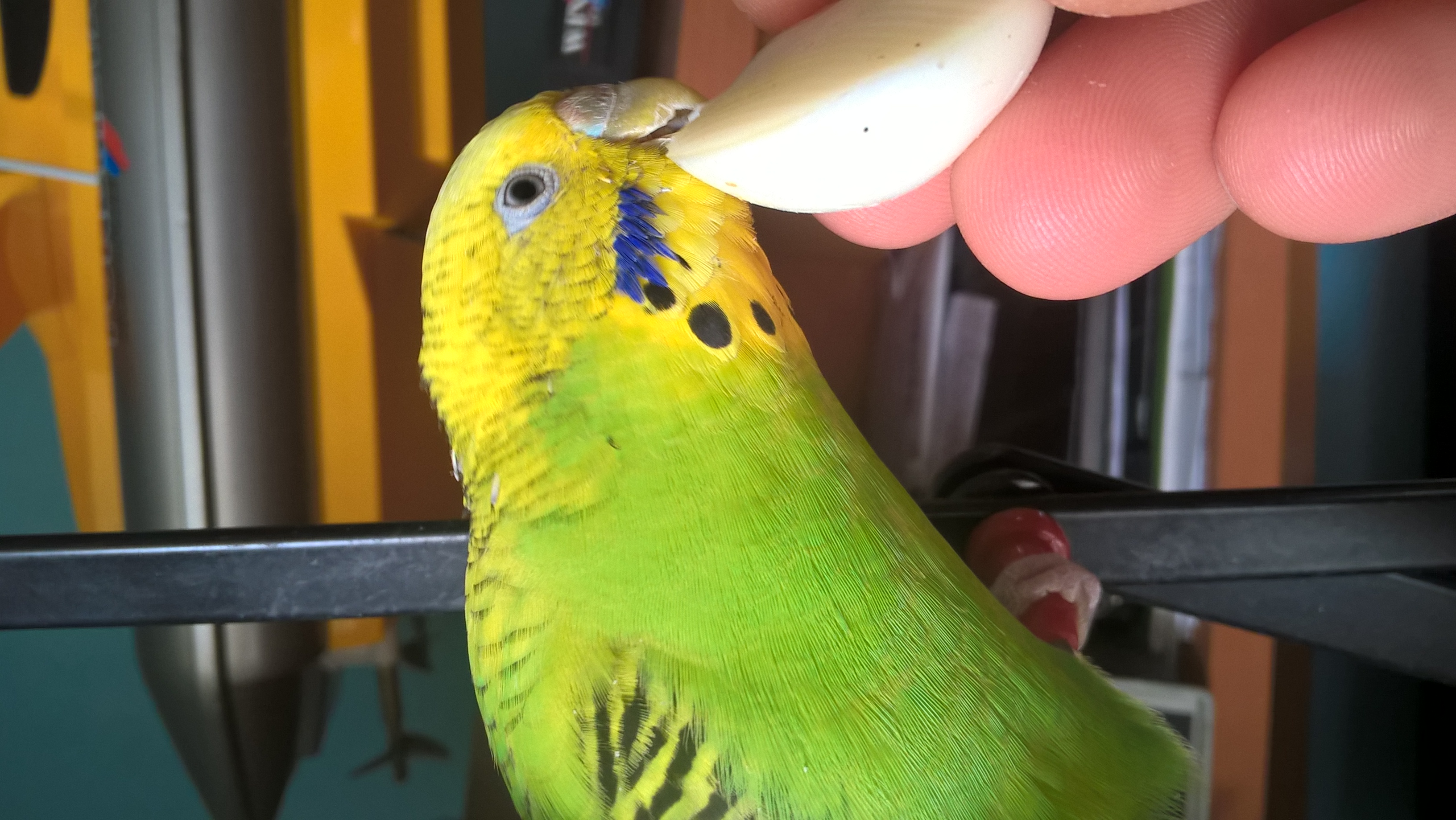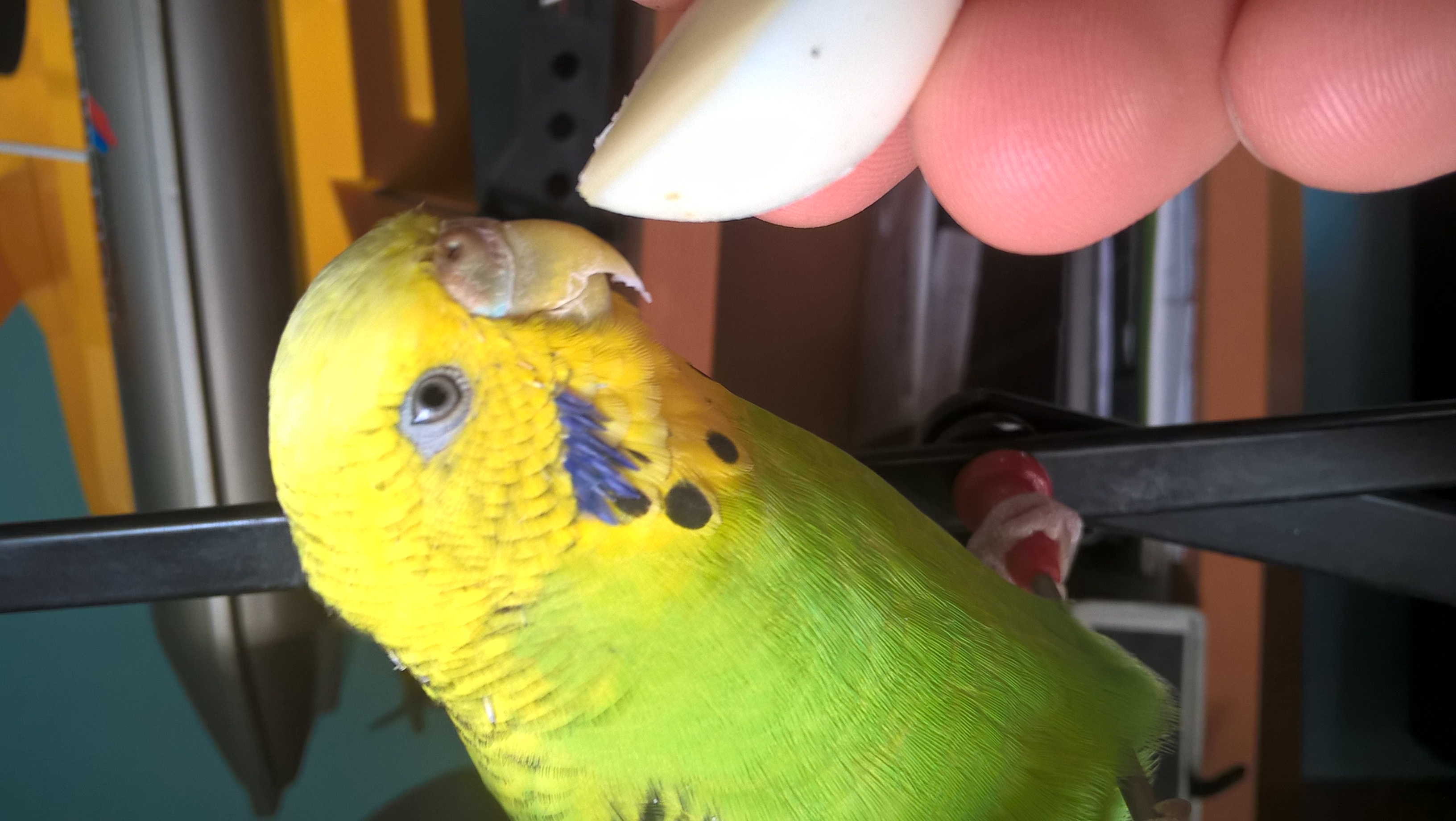 Mały ma raczej dobry nastrój, chętnie je z ręki (lubi warzywka, owoce i kiełki, gorzej zieleninke. Uwielbia jajko, lecz nie wiem jak często mu je podawać), ćwiergota, lata po mieszkaniu i ląduje na głowie :)