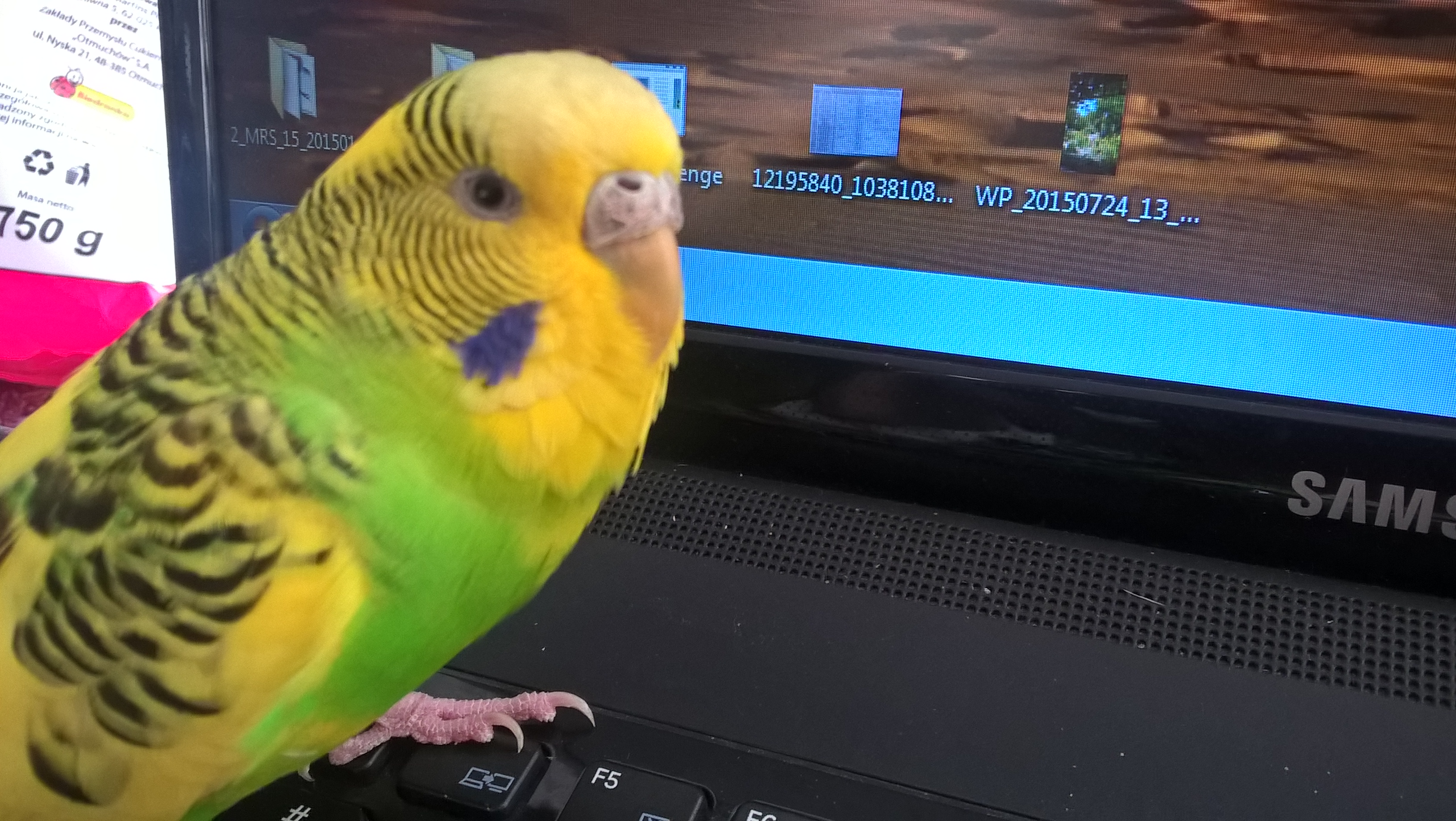 A papużka ma w karmie kolorowe dodatki, ale pół roku karmie ją tą karma i nic podobnego się nie działo. Piórka na głowie są jak zwykle puszyste i gładkie, tylko mają lekki odcień pomarańczowego. I woskówka wygląda jakby nadmiernie mu się łuszczyła.
