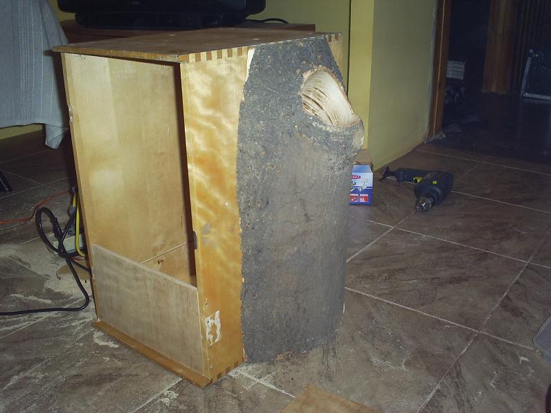 Tak miało być ,że budka miała wisieć na zewnątrz ,a pień w środku tylko był problem bo za klatką od strony okna nie ma juz ściany i mąż chciał powiesić to na klatce.Ale żeby to zrobić musiał by otworzyć okna od zabudowy przy jednoczesnym lataniu papug po balkonie