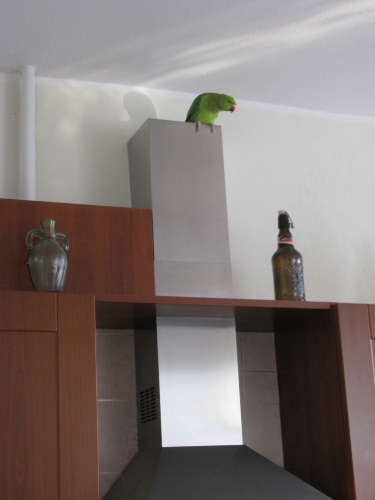 Klatka z papuga musi być tak ustawiona, by papuga patrzyła na wszystko z góry. WOwczas to poczuje się bezpiecznie. Dlatego też kuchnia nie jest dobrym pomieszczeniem , wiadomo wszystkie smrodki i opary unoszą sie pod sufitem, co nie wrózy papuzce dobrze.....