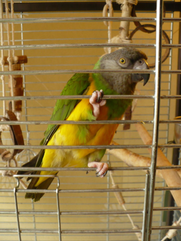 ,jest nadzieja ,że kiedyś będą parą,zainteresowanie samca nową koleżanką jest różne,musimy uważać nawet ,gdy mała siada na klatce senegalca ,by ten przez pręty dziobem nie skaleczył jej łapek,ale i ona już teraz robi się zadziora i sprytnie odlatuje unikając dziobnięcia,po takim lekkim zamieszaniu potrafią przez chwilę siedzieć cichutko i dotykać się dziobkami ,coś tam po swojemu świergocząc,fajnie to wygląda bo Piotrek wtedy nastawia łepek by mała go miziała,