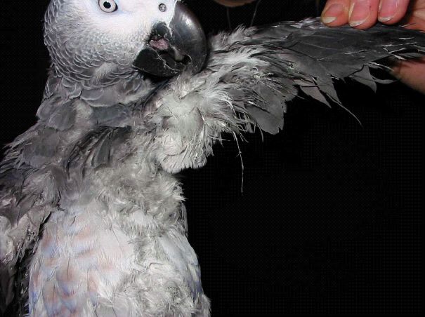 marcel się okaleczał zanim trafił do mnie od tamtej pory jest z nim bardzo dobrze i obecnie ma normalne nieczesane ani nie przycinane pióra i to na nim stosowałam spray jak widać działał :)