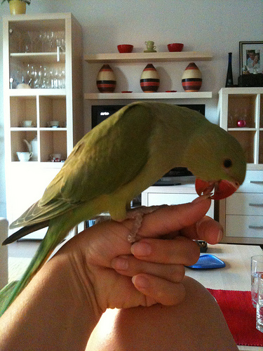 Mieszkam w Mannheim w Niemczech. U nas aleksandretty zyja na wolnosci. Jakies 50 lat temu przywiozla je jakas para z Hiszpani i tak sie u nas zadomowily:) U nas w miescie i w okolicach zyje ich juz kilka tysiecy:))) 8 lat temu zaraz po przyjezdzie szlam zima przez park i nagle zobaczylam przelatujace stadko zielonych papug.... usiadlam na lawce i sie zastanawialam co ja wczoraj pilam???? a poza tym to sie widzi biale myszki a nie zielone papugi!!! :))) Jeden telefon do mamy i sprawa wyjasniona:) No zyja tu:) Caly rok:) i rozmnazaja w zastraszajacym tempie:) 6 tygodni temu w okropny upal przejezdzalam kolo parku i na srodku ulicy siedzila taka jedna... zielona z czerwonym dziobem i totalnie zdezorientowana... Zatrzymalam ruch, wyskoczylam z auta i ja uratowalam:) Przyjechalam do domu, poszlam do sasiadow pozyczyc klatke, otworzylam bagaznik a ona fruuuu i poleciala.... zal mi sie jej zrobilo bo myslalam ze moze chora jest czy cos jej jest... ale sasiad stwierdzil ze jak poleciala to tak zle nie moze byc.... ale mi to spokoju nie dawalo. Po godzinie poszlam jeszcze raz do krzaka w kierunku ktorego poleciala i ja znalazlam:) 5 min przez okropna burza... Na drugi dzien pojechalysmy do lekarza. Wet stwierdzila ze to mlode ptaszysko ma jakies 6-8 tygodni ma i pewnie wypadla z gniazda i jeszcze dostala lekkiego udaru. Szanse na przezycie bez rodzicow marne.... Przez tydzien siedziala w takie malej klatce (jakies 50 na 60cm) a my w domu sie zastanawialismy z mezem czy ja zatrzymac czy oddac.... Przyzwyczailismy sie juz po 3 dniach:)) Jest kochana, na maksa ufna, wchodzila od razu na palec, jadla z reki wogole sie nas nie bala:))) Postanowilismy jej kupic woliere. Niestety nowe przekraczaja nasze mozliwosci finasowe (jakies 200-300 euro) i kupilismy uzywana od facet ulice obok:) Mozecie sobie wyobrazic mojego meza jak pchal 1.70 cm wysoka klatke po ulicy robiac niemilosierny halas blaszanym dachem..... myslalam ze umre ze smiechu:) W domu mi rece opadly jak zobaczylismy co kupilismy.... 6 godzin szorowania. Ten facet powinien siedziec za meczenie ptakow. Taki syf tam byl ze szok. Ale domylam. Dostala na imie Fibi i jest boska:) nie mialam pojecia ze ptaki sa takie inteligntne i cwane:))) Po przprowadzce troche zdziczala.... zaczela nas gryzc i uciekala.... potem znow zaczela sie przyzwyczajac. teraz ja wypuszczam codziennie na jakie 1,5 godziny i jest coraz lepiej:) zrobilam jej patyki do siedzenie z wierzby mandzurkiej i wisni:) Je wszystko, galazki, liscie, owoce, warzywa, ziarna ryz i bialko:) Uwielbia koperek:))) I czeresnie:)) I tak oto stalismy sie wlascicielami patka:))) Postaram sie wkleic kilka fot.