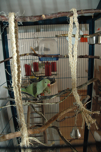 Krysia:)) No mamy sie dobrze:))) Fibi dobrze sie czuje, je wszystko co jej dajemy, co wieczor ja wypuszczamy na godzinke-dwie (wiem ze malo ale nie mam innych mozliwosci) i swietnie sie z nami dogaduje:)))) Jak ja tylko wypuscimy od rau leci do nas na sofe i chce sie z nami bawic:)) Uwielbia mojego meza i jest w nim bezgranicznie zakochana:)))) Z tego powodu ze ja na krotka wypuszczamy zrobilam jej hustawke i wstawilam do klatki mnostwo galazek zeby mmiala co robic jak nas neima:) Na razie malo sie ta hustawka interesuje ale sie jej nie boi. Zdjecie na dole:) Poza tym jak sie zbliza jej godzina wyjscia z klatki to rozrabia i sie awanturuje co bysmy o niej nie zapomnieli:))) No boska jest i tyle:) Nie ma juz szans zebysmy sie odkochali:)) Poza tym moj maz od poczatku jej gwizdal cztery tony. I teraz jak gaworzy to to powtarza:) Jestemy w szoku ze tak szybko:) A ja uwielbiam sluchac tego gaworzenia:) Fajnie z nia jest:))