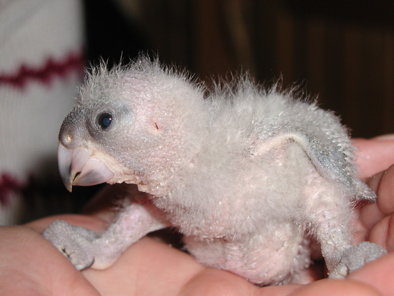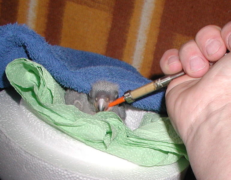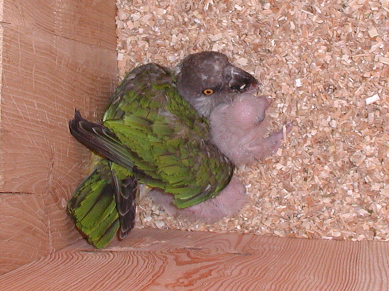 Po godzinie o 11,15 pęka drugie jajko i wszystko powtarza się dokładnie tak samo. Samiczka siada na młode, ogrzewa je. Dokładnie po 25 dniach i 4 godzinach wysiadywania, wykluły się. Pierwsze nieśmiałe karmienie o 16,25 . Następne co godzinę, półtorej w dzięń i noc. Samiczka w ciągu doby zjada pozostałe łupinki z jajek.