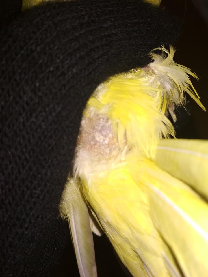 3 tygodnie temu ponowna wizyta u weterynarza: krwiak na części udowej nogi, który nie zszedł do tej pory (zdjęcie), udowa cześć jakby wykrzywiona, odma powietrzna po prawej strony nad ogonem wielkości 2cm (którą kazano mi przekuwać, ale się codziennie odbudowuje). Papuga ma ogromny apetyt i spore chęci do rozrabiania i latania, co najprawdopodobniej skończyło się właśnie tą kontuzją nogi. Dostała leki i miałam obserwować, czy je...Pani doktor stwiedziła, że zdjęcia nie zrobimy bez narkozy, ale z uwagi na wiek, nie ryzykujemy..