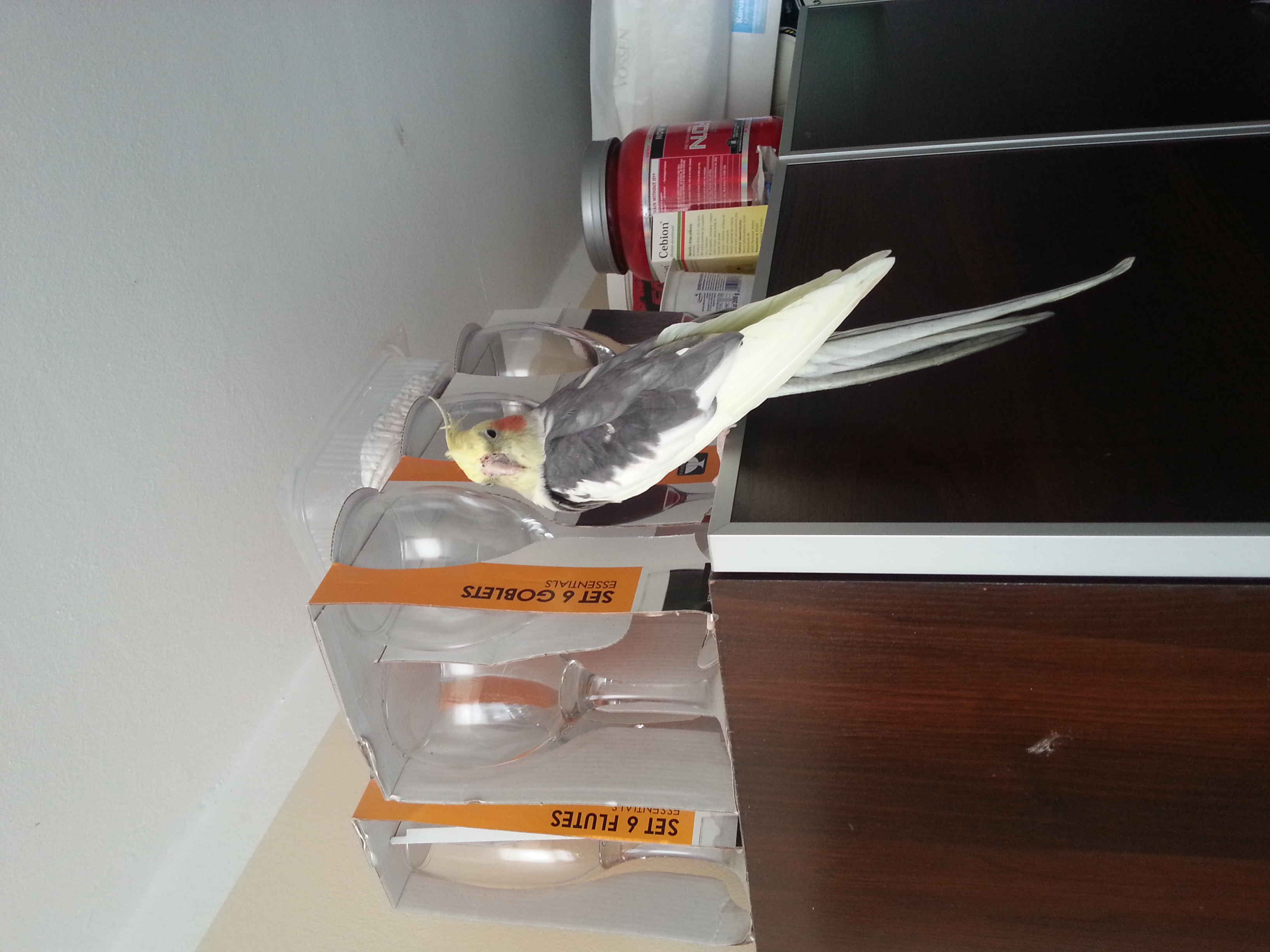 Co do płci, stawiam na samca. Nie widzę prążków na sterówkach, a pierwsze pióro w czubku odbija się charakterystycznie. Papuga może podnosić łapki, bo zwyczajnie jej drętwieją i chce je rozprostować. Powodem mogą być na przykład złe żerdzie w klatce lub niewłaściwe podłoże, po którym wcześniej poruszał się ptak.